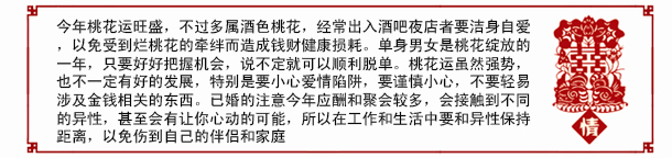 可与人合作。夫妻感情生活平稳,未婚的朋友可选择此月订婚结婚。身体健康多注意保养。