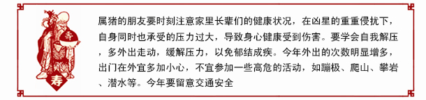 属猪的朋友今年的第七个月,本月运势不吉,为申亥相害之月。易犯小人,多有烦恼之事,不要和相冲相害的人合作。事业上宜守不宜攻,不可轻举妄动。须提防小人,稳下心来,等待时机。在这期间要照顾好家人的健康。